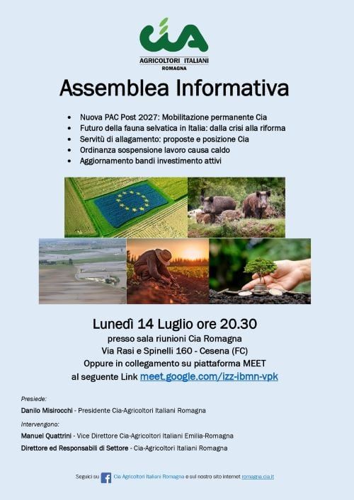 L’Assemblea informativa si terrà lunedì 14 luglio alle ore 20.30 nella sede di Cia Romagna a Cesena (via Rasi e Spinelli. N. 160) e si propone come uno spazio di confronto e aggiornamento, rivolto in primo luogo ai soci e ai collaboratori, su una pluralità di tematiche che attraversano trasversalmente l’attività quotidiana di Cia ai diversi livelli (territoriale, regionale e nazionale) e quella degli agricoltori.
