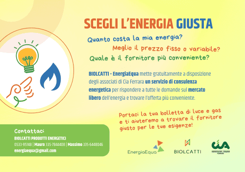 In seguito al passaggio al mercato libero di luce e gas, Cia-Agricoltori Italiani Ferrara propone un nuovo servizio di consulenza gratuito per gli associati, con l’obiettivo di sostenerli nella scelta del fornitore più economico e adatto alle esigenze domestiche e aziendali.