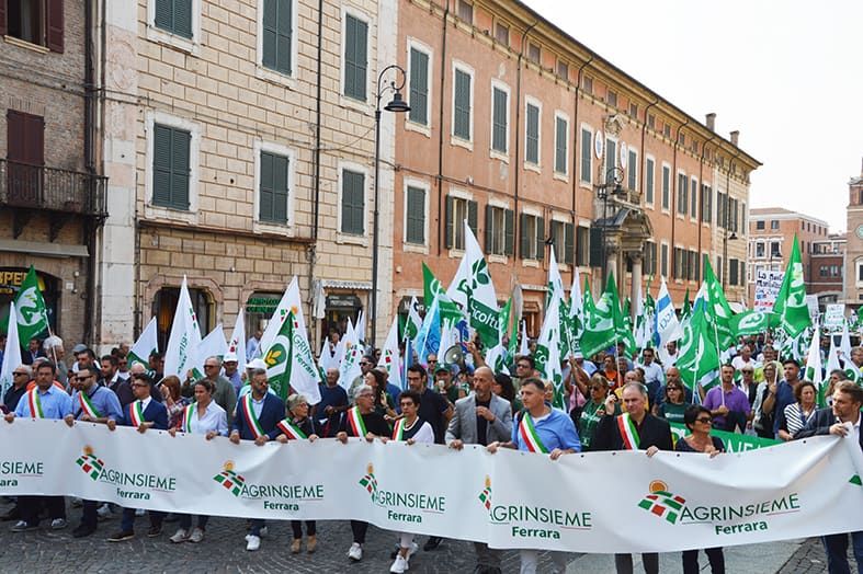 Il corteo – al quale hanno partecipato anche il sindaco di Ferrara Alan Fabbri, il consigliere regionale Paolo Calvano e molti sindaci del territorio – è partito da Porta Paola per fermarsi poi in piazza Savonarola, per i discorsi dei rappresentanti delle organizzazioni agricole e cooperative agroalimentari. Si è poi diretto alla prefettura dove una delegazione di agricoltori, sindaci del territorio, rappresentanti dei sindacati dei lavoratori e degli azzerati Carife ha consegnato alla viceprefetto vicario Pinuccia Niglio un documento dove si chiedono alcuni interventi immediati per consentire alle aziende agricole di risollevarsi.